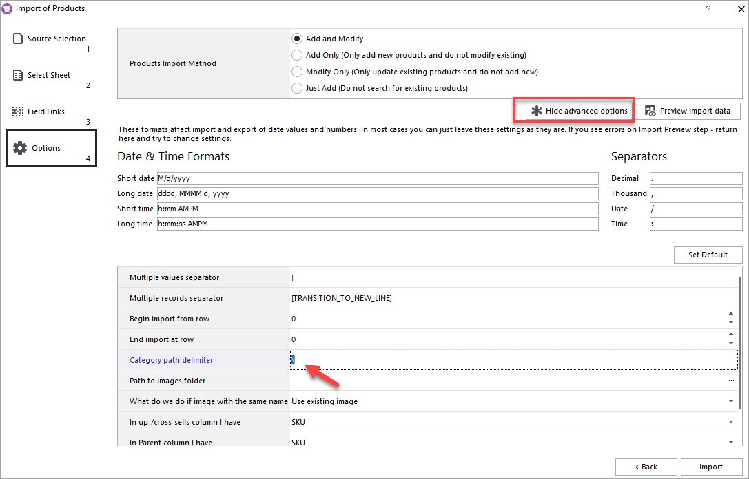 Also, expand the Advanced options section to select a correct delimiter for the category path and specify other settings related to your specific task.