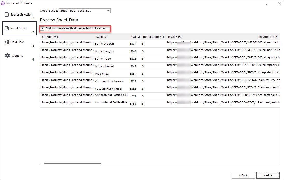 Preview data from the spreadsheet and check other options