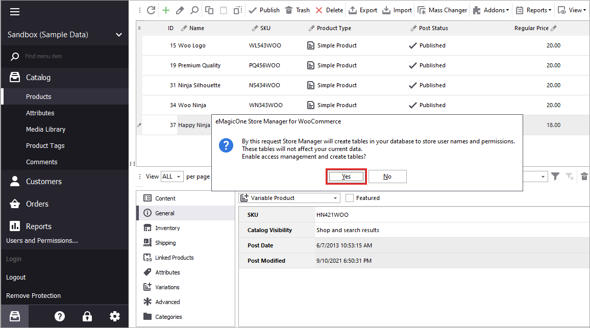 - There will appear a dialog window notifying that extra database tables will be created if Access Management is triggered. Hit Yes to complete activation.