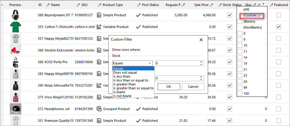 In the WooCommerce admin, you can actually apply filters, but only basic ones. Using Store Manager you can apply filters similar to Excel. You can apply filters to any field in the grid and use multiple conditions to display required data.