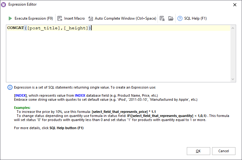 Also, you can use the Expression Editor for more advanced updates. For instance, to generate SKUs by concatenating product name and product height fields, select the SKU field in the first drop-down and opt for Use Expression in the second drop-down. Then write the following expression: