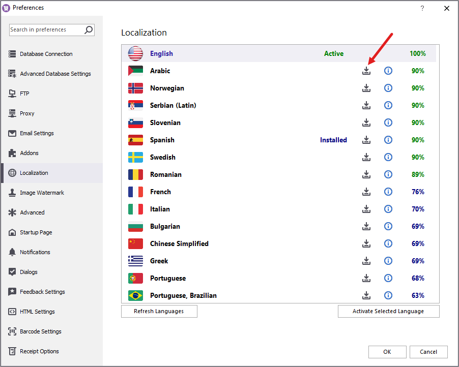 Once Store Manager supports your language, start the application and reach Preferences by pressing F12 or via Settings>>Preferences. Open 'Localization' section and click on download button next to your language and press OK.